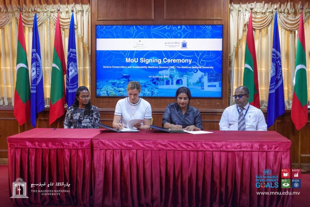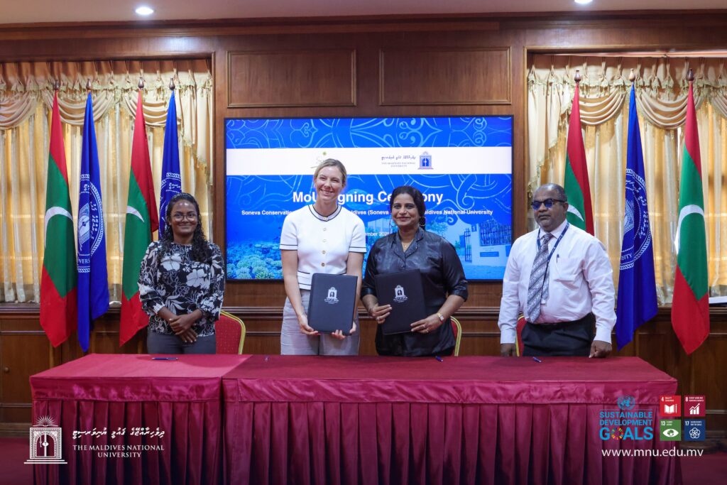 އެމްއެންޔޫގެ ދަރިވަރުންނަށް އިންޓަރންޝިޕްގެ ފުރުޞަތު ފަހިކޮށްދީ، މެރިން ސައިންސްގެ ދާއިރާއިން ދިރާސާކުރުމަށް މޯލްޑިވްސް ނޭޝަނަލް ޔުނިވަރސިޓީ (އެމްއެންޔޫ) އާއި ސޮނެވާ ކޮންޒަވޭޝަން އެންޑް ސަސްޓެއިނަބިލިޓީ މޯލްޑިވްސް (ސޮނެވާ ސީއެސްއެމް) އާ ދެމެދު މެމޮރެންޑަމް އޮފް އަންޑަސްޓޭންޑިންގ (އެމްއޯޔޫ) އެއްގައި ސޮއިކޮށްފިއެވެ.