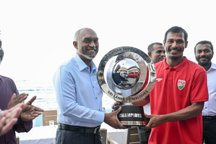 ރައީސުލްޖުމްހޫރިއްޔާ ވަނީ ރާއްޖޭގެ ޤައުމީ ފުޓްބޯޅަ ޓީމް، ސައުތު އޭޝިއަން ސުޕަރ ކަޕް 2025، ކާމިޔާބުކުރިކަން ފާހަގަކުރައްވައި ކުރިއަށްއޮތް ތަނުގައިވެސް ރާއްޖެއަށް ރީތި ނަން ހޯއްދަވައިދެއްވުމަށް އެދިވަޑައިގެންފައެވެ. ރައީސުލްޖުމުހޫރިއްޔާ ވަނީ، ޤައުމީ ޓީމު ކުރަމުން އަންނަ މަސައްކަތަށް ހިތްވަރުދެއްވައި، އަބަދުވެސް ޤައުމީ ޓީމަށް ކާމިޔާބީއަށް އެދިވަޑައިގެންފައެވެ.