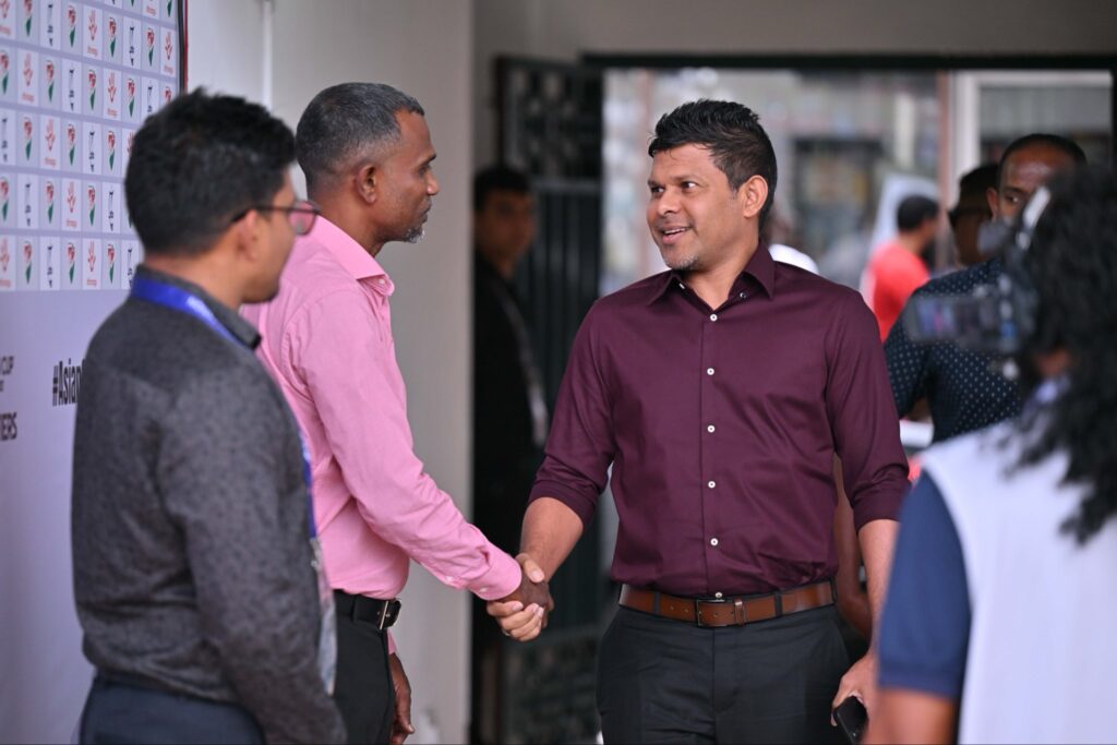 ރައީސުލްޖުމްހޫރިއްޔާގެ ނައިބު، ގަލޮޅު ރަސްމީ ދަނޑަށް ވަޑައިގަތުމުން އެ މަނިކުފާނަށް މަރުޚަބާ ދެންނެވީ ފުޓްބޯޅަ އެސޯސިއޭޝަން އޮފް މޯލްޑިވްސްގެ ރައީސް އަޙްމަދު ޠާރިޤެވެ.