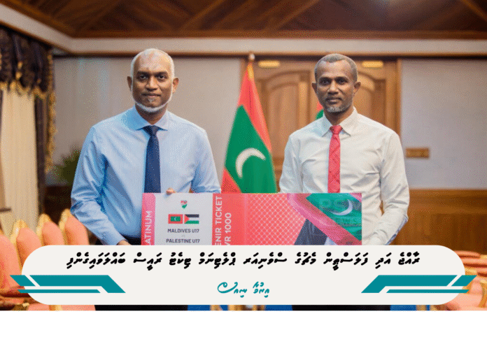ދިވެހިރާއްޖޭގެ 17 އަހަރުން ދަށުގެ ޓީމާއި ފަލަސްޠީނުގެ 17 އަހަރުން ދަށުގެ ޓީމު ރާއްޖޭގައި ކުޅޭ އެކުވެރިކަމުގެ ފުރަތަމަ މެޗުގެ ސްވެނިއަރ ޕްލެޓިނަމް ޓިކެޓު ރައީސުލްޖުމްހޫރިއްޔާ ޑރ. މުހައްމަދު މުޢިއްޒު މިއަދު ބައްލަވައިގެންފިއެވެ.