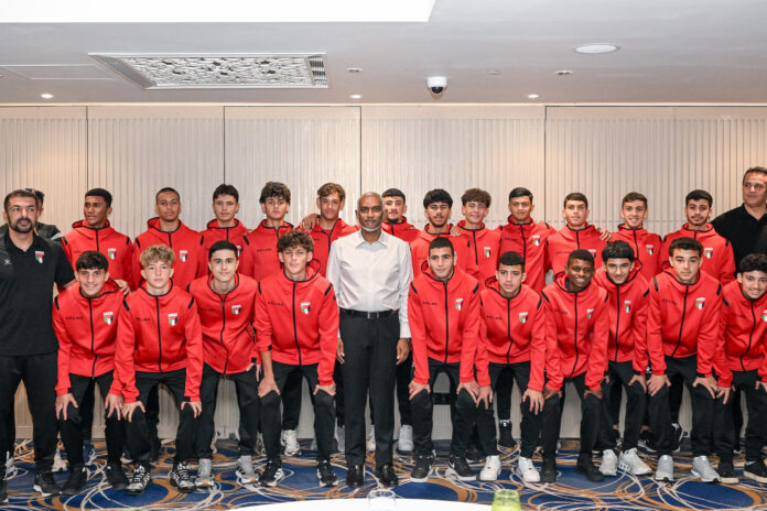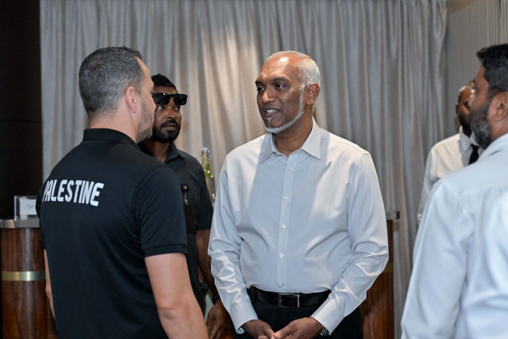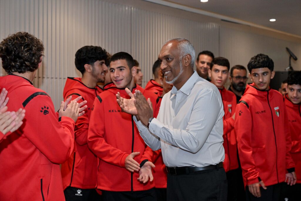 ރައީސުލްޖުމުހޫރިއްޔާ ޑޮކްޓަރ މުޙައްމަދު މުޢިއްޒާއި އެމަނިކުފާނުގެ އަނބިކަނބަލުން ސާޖިދާ މުޙައްމަދު، ފަލަސްޠީނުގެ 17 އަހަރުންދަށުގެ ފުޓްބޯޅަ ޓީމަށް މެންދުރުގެ ފަރިއްކޮޅެއް ދެއްވައިފިއެވެ. މިފަރިއްކޮޅު އޮތީ ހޮޓެލްޖެންގެ ބޯލްރޫމުގައެވެ.