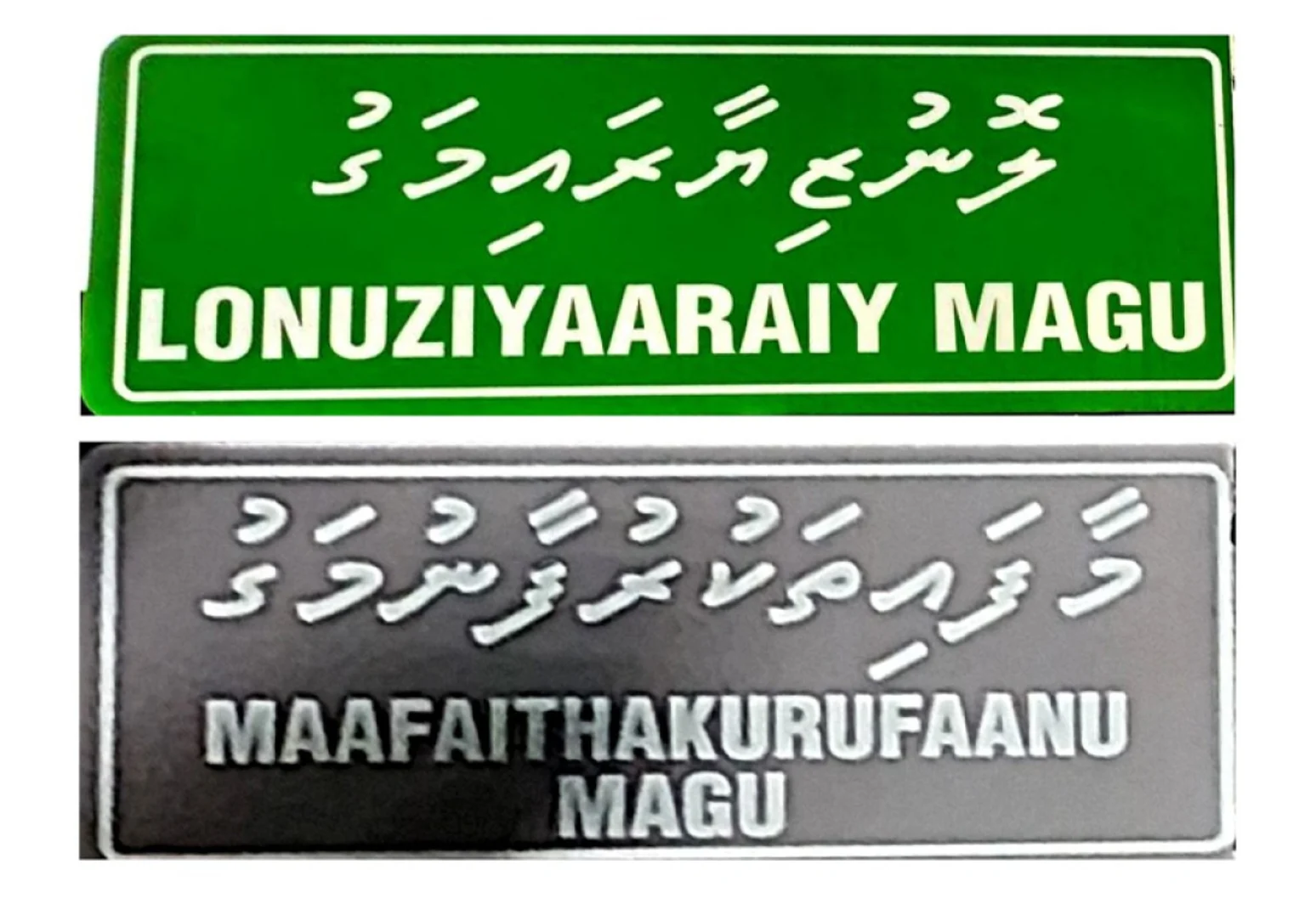 މި ނަންބޯޑުތަކުގެ ފޮޓޯތައް މީސް މީޑިއާގެ އެކި މަންސަތަކުގައި މިހާރު ދައުރުވަމުން އަންނައިރު، އެ ފޮޓޯތަކުން ފެނިގެންދަނީ ލޮނުޒިޔާރަތްމަގު އަދި މާފަތްތަކުރުފާނުމަގުގެ ނަން ނުބައިކޮށް ތާނައިން ލެޓިނުން ވެސް ލިޔެފައިވާތަނެވެ. އެގޮތުން ލޮނުޒިޔާރަތްމަގުގެ ނަން ލިޔެފައި ތާނައިން ލިޔެފައި އޮތީ ”ލޮނުޒިޔާރައިމަގު“ އަދި މާފަތްތަކުރުފާނުމަގުގެ ނަން ލިޔެފައި އޮތީ ”މާފައިތަކުރުފާނުމަގު“ މިހެންނެވެ.