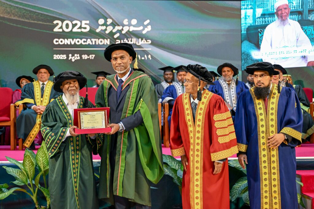 އިސްލާމީ ޔުނިވަރސިޓީގެ 2025 ވަނަ އަހަރުގެ ދަސްވެނިވުމުގެ ރަސްމިއްޔާތުގައި ރޭ ބޭއްވުނު ޚާއްޞަ ޙަފްލާއެއްގައި ފަޟީލަތުއްޝައިޚް އިސްމާޢީލު މުޙައްމަދަށް މި ޝަރަފު ޙަވާލުކޮށްދެއްވީ ރައީސުލްޖުމްހޫރިއްޔާ ޑރ. މުހައްމަދު މުޢިއްޒު އެވެ.