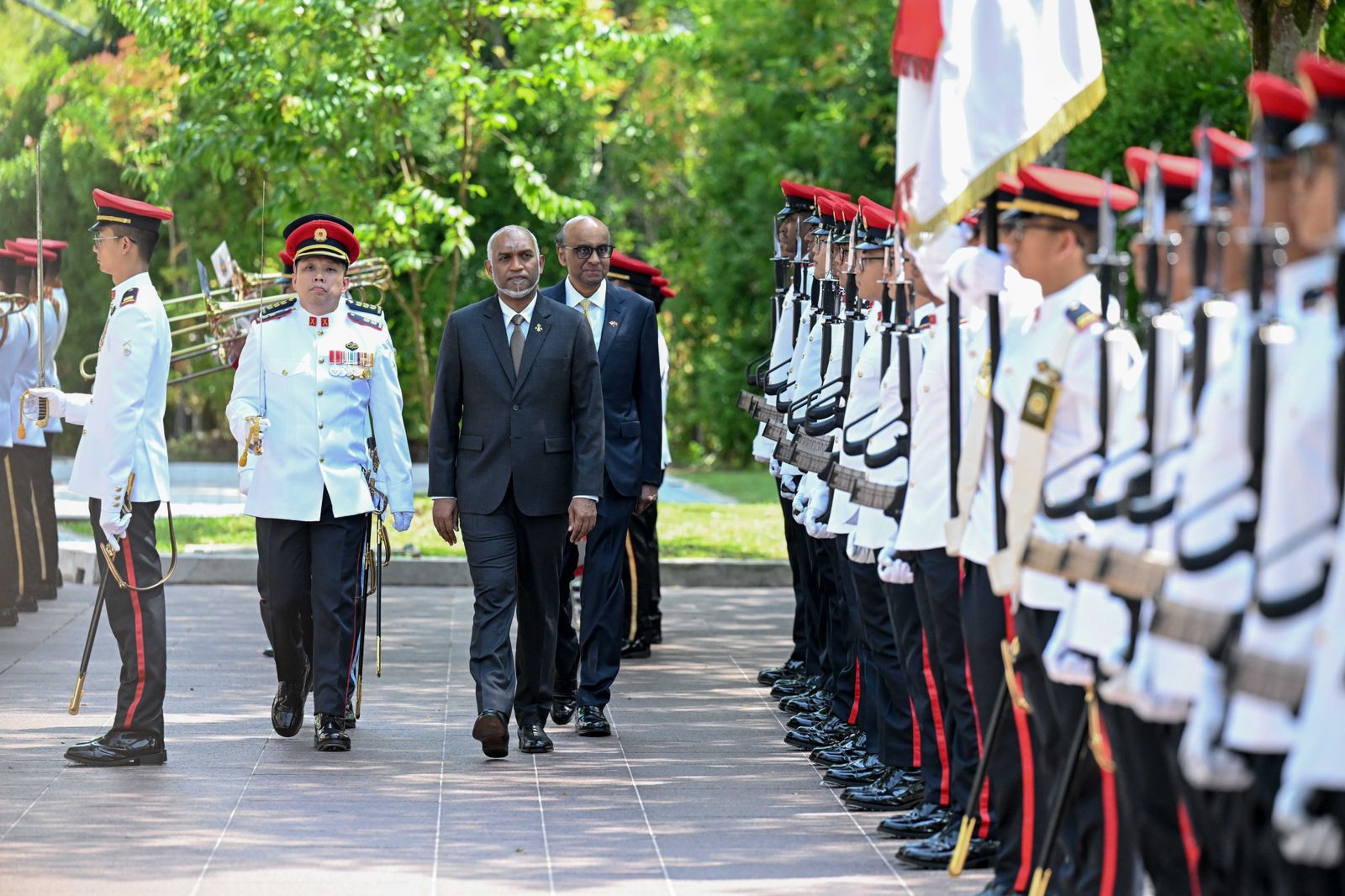 ރައީސްގެ ދެކަނބަލުން އިއްޔެ ފެއްޓެވި މި ދަތުރުފުޅަކީ ސިންގަޕޫރުގެ ރައީސް ތަރްމަން ޝަންމުގަރަނަމްގެ ދައުވަތަކަށް ކުރެއްވި ދަތުރުފުޅެކެވެ. ރައީސް މުޢިއްޒުއާއި ފަސްޓް ލޭޑީ މެޑަމް ސާޖިދާ މުހައްމަދަށް ސިންގަޕޫރުގެ ރައީސް ރަސްމީކޮށް މަރުހަބާ ދެންނެވުމަށް ބޭއްވި ރަސްމިއްޔާތުގައި އެމަނިކުފާނަށް ގާޑް އޮފް އޮނާއެއް އެރުވިއެވެ.