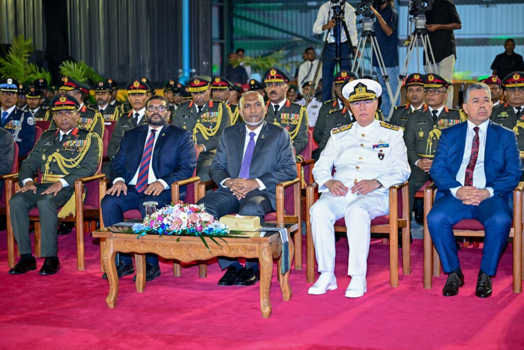 މިކަމަށްޓަކައި ހުޅުމާލޭ އެމްޕީއެލް ސަރަހައްދުގައި ބޭއްވި ރަސްމިއްޔާތަށް ރައީސުލްޖުމްހޫރިއްޔާ ޑޮކްޓަރ މުޙައްމަދު މުއިއްޒު ވަޑައިގަތުމުން އެމަނިކުފާނަށް މަރުޙަބާ ދެންނެވީ ދިފާޢީ ވަޒީރު މުޙައްމަދު ޢައްސާން މައުމޫން އަދި ޗީފް އޮފް ޑިފެންސް ފޯސް މޭޖަރ ޖެނެރަލް އިބްރާހީމް ޙިލްމީއެވެ.