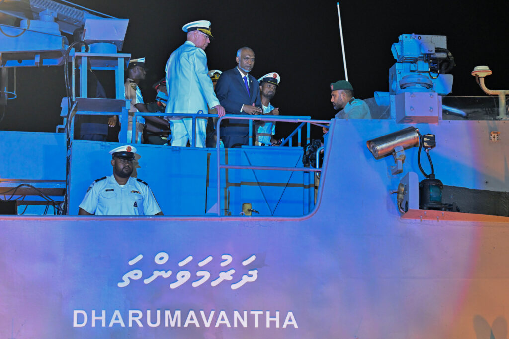 ތުރުކީވިލާތުން ދިވެހިރާއްޖެއަށް ހަދިޔާކުރި މަނަވަރު، ”ދަރުމަވަންތަ“ ދިވެހިރާއްޖޭގެ ޤައުމީ ދިފާޢީ ބާރާ ޙަވާލުކުރުމުގެ ރަސްމިއްޔާތު ރައީސުލްޖުމްހޫރިއްޔާ އަދި ސިފައިންގެ އެންމެ މަތީވެރިޔާ، ޑޮކްޓަރ މުޙައްމަދު މުޢިއްޒު ޝަރަފުވެރިކޮށްދެއްވައިފިއެވެ.